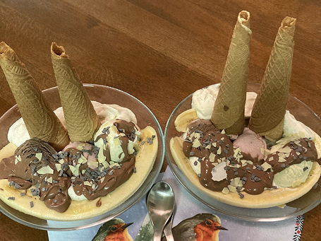 Wir bereiten ein Bananensplit-Dessert zu.